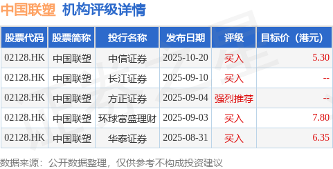 投行对该股的评级以买入为主,近90天内共有4家投行给出买入评级,近90天的目标均价为6.48港元。中信证券最新一份研报给予中国联塑买入评级,目标价5.3港元。