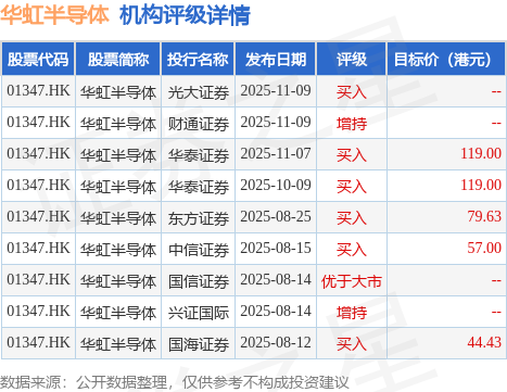 投行对该股的评级以买入为主,近90天内共有6家投行给出买入评级,近90天的目标均价为83.81港元。光大证券最新一份研报给予华虹半导体买入评级。