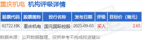 投行对该股的评级以买入为主,近90天内共有1家投行给出买入评级,近90天的目标均价为2.65港元。国元国际控股最新一份研报给予重庆机电买入评级,目标价2.65港元。