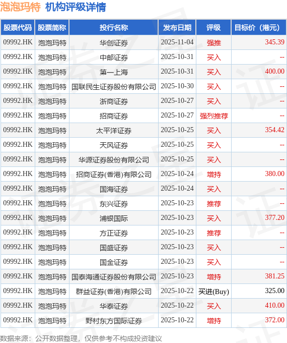 投行对该股的评级以买入为主,近90天内共有40家投行给出买入评级,近90天的目标均价为374.16港元。华创证券最新一份研报给予泡泡玛特强推评级,目标价345.39港元。