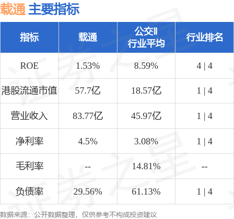 载通港股市值57.7亿港元,在公交Ⅱ行业中排名第1。主要指标见下表: