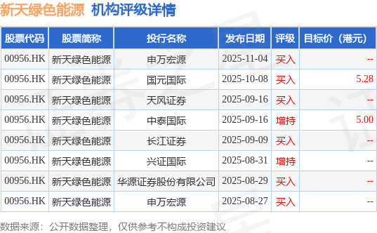 截至2025年11月10日收盘,新天绿色能源(00956.HK)报收于4.61港元,下跌1.91%,成交量488.6万股,成交额2266.15万港元。投行对该股的评级以买入为主,近90天内共有6家投行给出买入评级,近90天的目标均价为5.14港元。申万宏源最新一份研报给予新天绿色能源买入评级。
