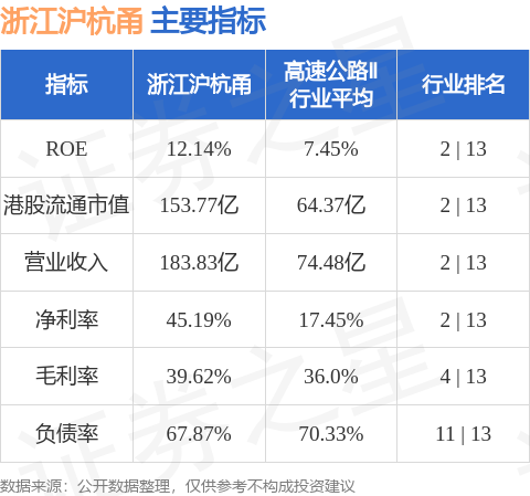 浙江沪杭甬港股市值153.77亿港元,在高速公路Ⅱ行业中排名第2。主要指标见下表: