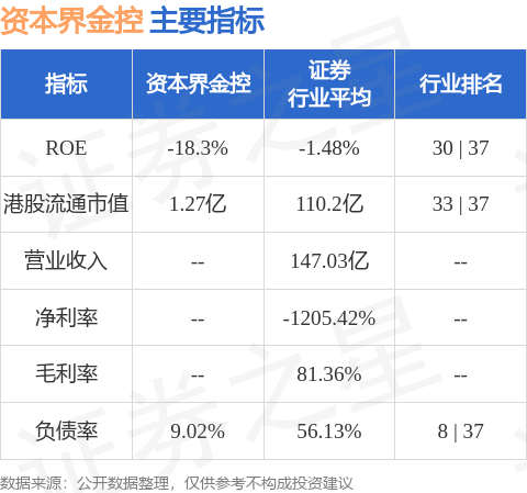 资本界金控港股市值1.27亿港元,在证券行业中排名第33。主要指标见下表:
