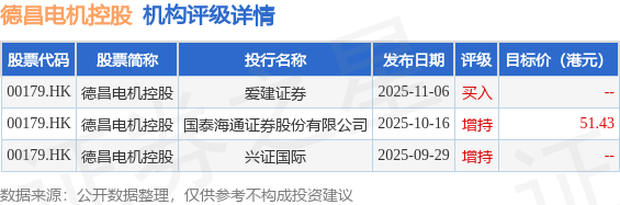 投行对该股的评级以增持为主,近90天内共有2家投行给出增持评级,近90天的目标均价为51.43港元。爱建证券最新一份研报给予德昌电机控股买入评级。