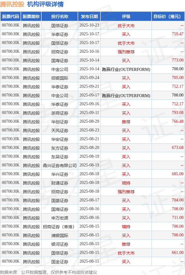 投行对该股的评级以买入为主,近90天内共有17家投行给出买入评级,近90天的目标均价为720.24港元。国信证券最新一份研报给予腾讯控股优于大市评级。