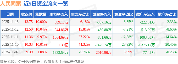 证券之星消息,人民同泰11月13日涨停收盘,收盘价13.75元。该股于9点25分涨停,未打开涨停,截止收盘封单资金为2.56亿元,占其流通市值3.21%。