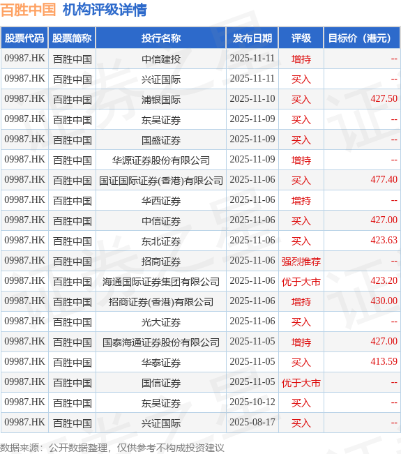 截至2025年11月13日收盘,百胜中国(09987.HK)报收于359.2港元,下跌0.55%,成交量37.56万股,成交额1.35亿港元。投行对该股的评级以买入为主,近90天内共有11家投行给出买入评级,近90天的目标均价为431.16港元。中信建投最新一份研报给予百胜中国增持评级。