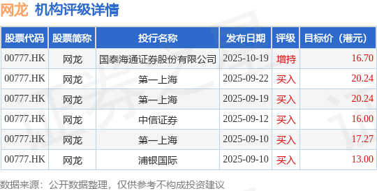 截至2025年11月13日收盘,网龙(00777.HK)报收于11.86港元,下跌0.67%,成交量274.65万股,成交额3230.51万港元。投行对该股的评级以买入为主,近90天内共有5家投行给出买入评级,近90天的目标均价为17.24港元。国泰海通证券股份有限公司最新一份研报给予网龙增持评级,目标价16.7港元。