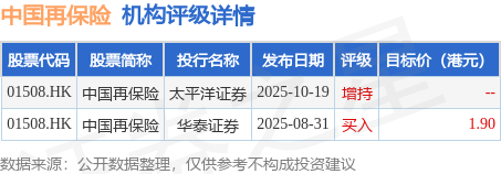截至2025年11月13日收盘,中国再保险(01508.HK)报收于1.66港元,上涨0.61%,成交量1135.85万股,成交额1868.42万港元。投行对该股的评级以增持为主,近90天内共有1家投行给出增持评级,近90天的目标均价为1.9港元。太平洋证券最新一份研报给予中国再保险增持评级。