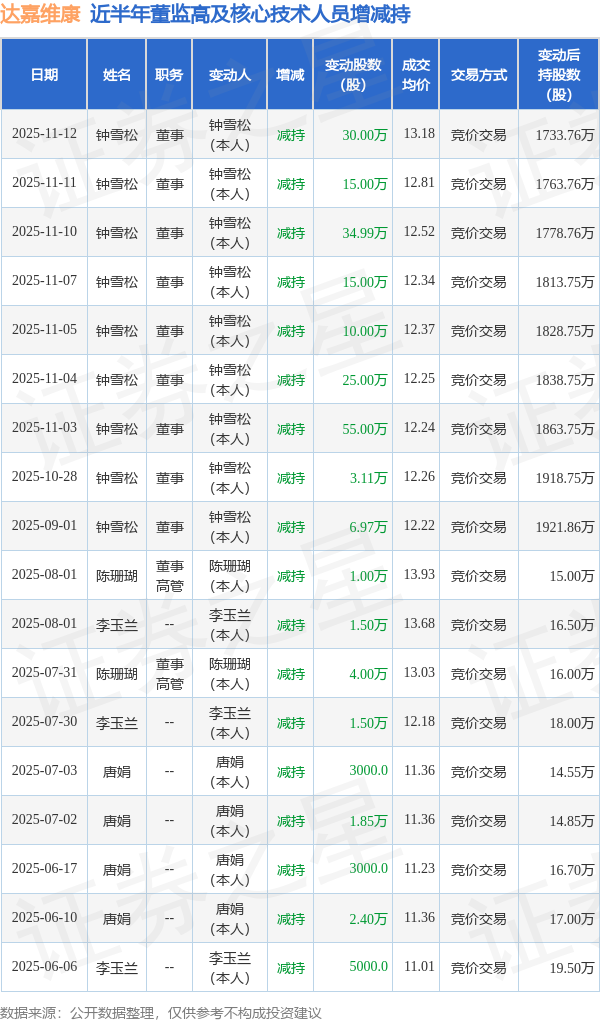 达嘉维康近半年内的董监高及核心技术人员增减持详情如下: