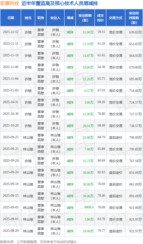 宏景科技近半年内的董监高及核心技术人员增减持详情如下: