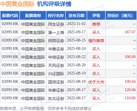 投行对该股的评级以买入为主,近90天内共有7家投行给出买入评级,近90天的目标均价为119.55港元。民生证券最新一份研报给予中国黄金国际推荐评级。