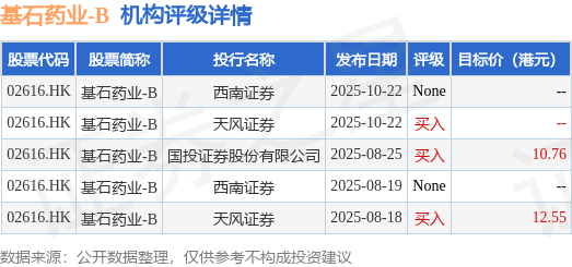 投行对该股的评级以买入为主,近90天内共有3家投行给出买入评级,近90天的目标均价为11.66港元。西南证券最新一份研报给予基石药业-BNone评级。