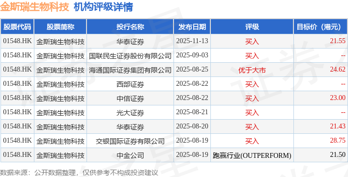 投行对该股的评级以买入为主,近90天内共有7家投行给出买入评级,近90天的目标均价为23.48港元。华泰证券最新一份研报给予金斯瑞生物科技买入评级,目标价21.55港元。