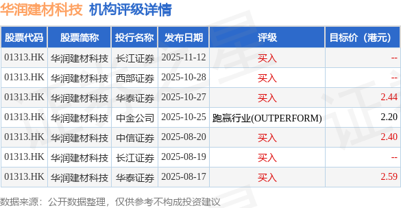 投行对该股的评级以买入为主,近90天内共有6家投行给出买入评级,近90天的目标均价为2.41港元。长江证券最新一份研报给予华润建材科技买入评级。