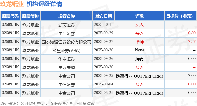 投行对该股的评级以买入为主,近90天内共有4家投行给出买入评级,近90天的目标均价为6.63港元。浙商证券最新一份研报给予玖龙纸业买入评级。