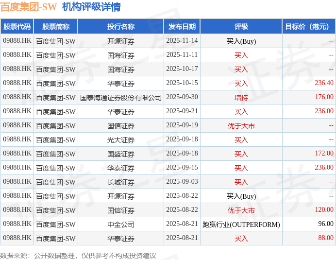 截至2025年11月14日收盘,百度集团-SW(09888.HK)报收于117.1港元,下跌7.21%,成交量2788.08万股,成交额32.47亿港元。投行对该股的评级以买入为主,近90天内共有9家投行给出买入评级,近90天的目标均价为170.05港元。开源证券最新一份研报给予百度集团-SW买入(Buy)评级。