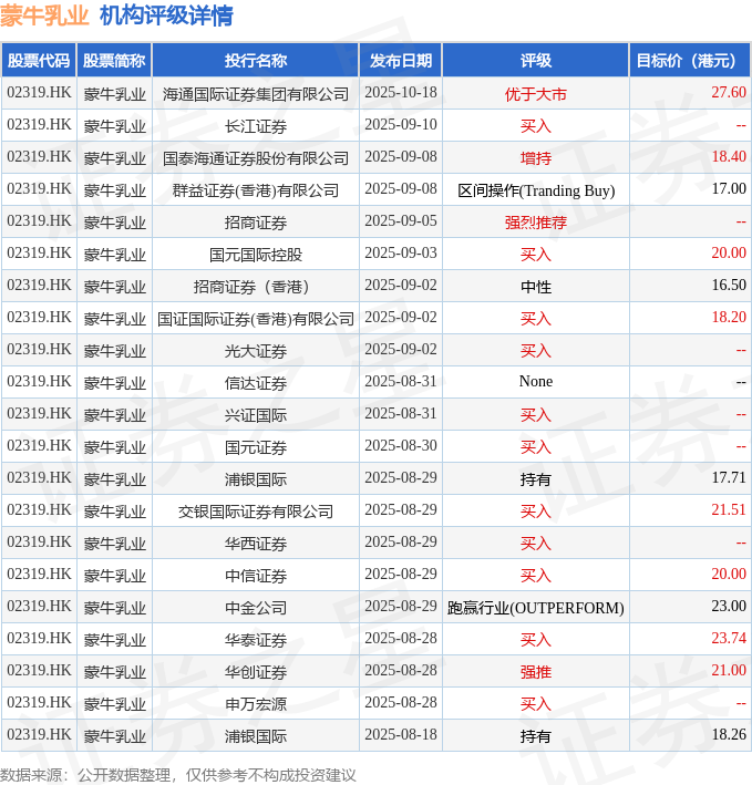 截至2025年11月14日收盘,蒙牛乳业(02319.HK)报收于14.87港元,下跌1.78%,成交量1577.13万股,成交额2.36亿港元。投行对该股的评级以买入为主,近90天内共有11家投行给出买入评级,近90天的目标均价为20.22港元。海通国际证券集团有限公司最新一份研报给予蒙牛乳业优于大市评级,目标价27.6港元。