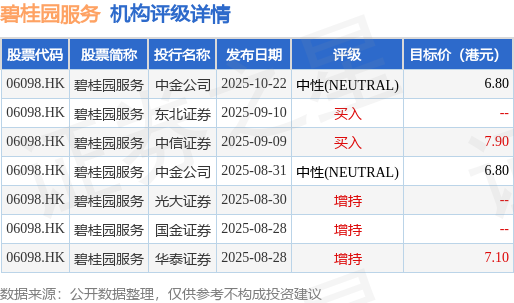 截至2025年11月14日收盘,碧桂园服务(06098.HK)报收于6.39港元,下跌1.24%,成交量477.49万股,成交额3049.47万港元。投行对该股的评级以增持为主,近90天内共有3家投行给出增持评级,近90天的目标均价为7.15港元。中金公司最新一份研报给予碧桂园服务中性(NEUTRAL)评级,目标价6.8港元。