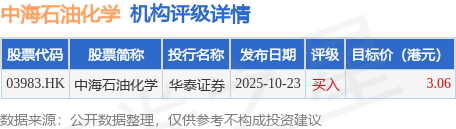 截至2025年11月14日收盘,中海石油化学(03983.HK)报收于2.6港元,下跌3.35%,成交量420.6万股,成交额1106.51万港元。投行对该股的评级以买入为主,近90天内共有1家投行给出买入评级,近90天的目标均价为3.06港元。华泰证券最新一份研报给予中海石油化学买入评级,目标价3.06港元。