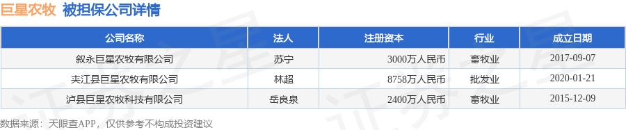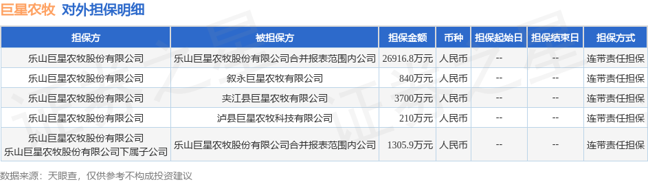 巨星农牧11月13日披露5笔对外担保,被担保公司4家。对外担保明细如下表: