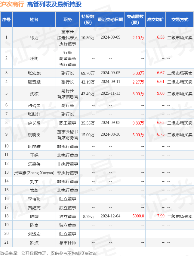 沪农商行近半年内的董监高及核心技术人员增减持详情如下: