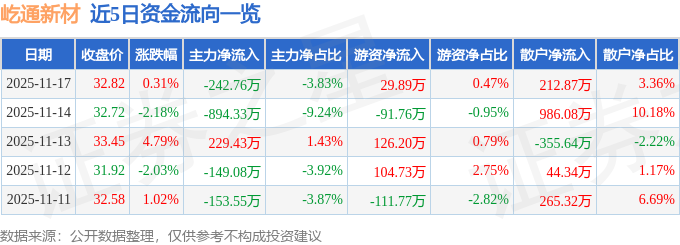 证券之星消息,截至2025年11月17日收盘,屹通新材(300930)报收于32.82元,上涨0.31%,换手率4.09%,成交量1.93万手,成交额6335.35万元。