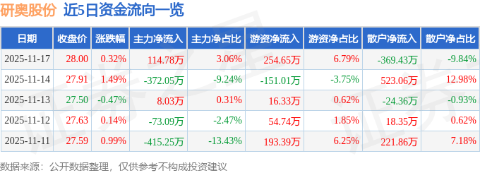 证券之星消息,截至2025年11月17日收盘,研奥股份(300923)报收于28.0元,上涨0.32%,换手率1.75%,成交量1.34万手,成交额3752.44万元。
