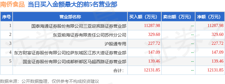 证券之星消息,沪深交易所2025年11月21日公布的交易公开信息显示,南侨食品(605339)因有价格涨跌幅限制的日收盘价格涨幅偏离值达到7%的前五只证券登上龙虎榜。此次是近5个交易日内第2次上榜。