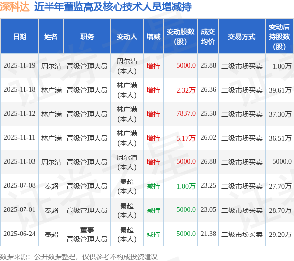 深科达近半年内的董监高及核心技术人员增减持详情如下: