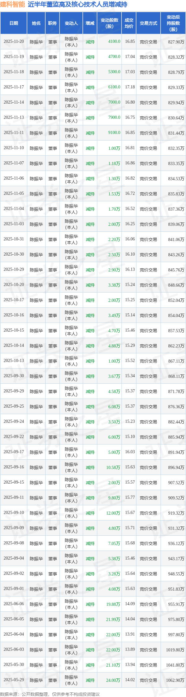 建科智能近半年内的董监高及核心技术人员增减持详情如下: