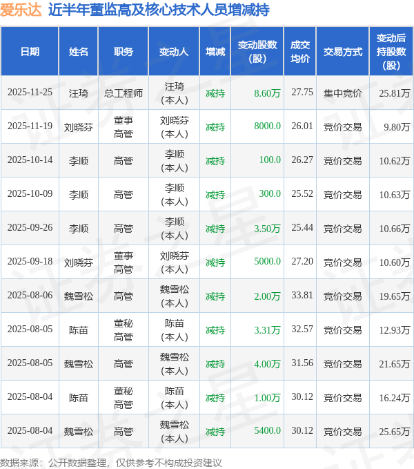 爱乐达近半年内的董监高及核心技术人员增减持详情如下:
