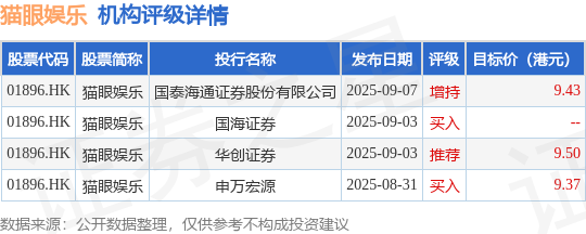 截至2025年11月28日收盘,猫眼娱乐(01896.HK)报收于6.91港元,上涨1.92%,成交量541.56万股,成交额3728.65万港元。投行对该股的评级以买入为主,近90天内共有2家投行给出买入评级,近90天的目标均价为9.43港元。国泰海通证券股份有限公司最新一份研报给予猫眼娱乐增持评级,目标价9.43港元。