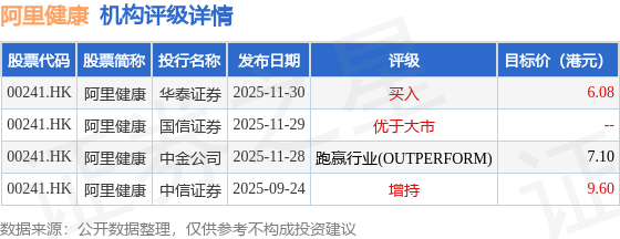 截至2025年12月2日收盘,阿里健康(00241.HK)报收于5.45港元,下跌1.09%,成交量7795.06万股,成交额4.25亿港元。投行对该股的评级以跑赢行业(OUTPERFORM)为主,近90天内共有1家投行给出跑赢行业(OUTPERFORM)评级,近90天的目标均价为7.59港元。华泰证券最新一份研报给予阿里健康买入评级,目标价6.08港元。