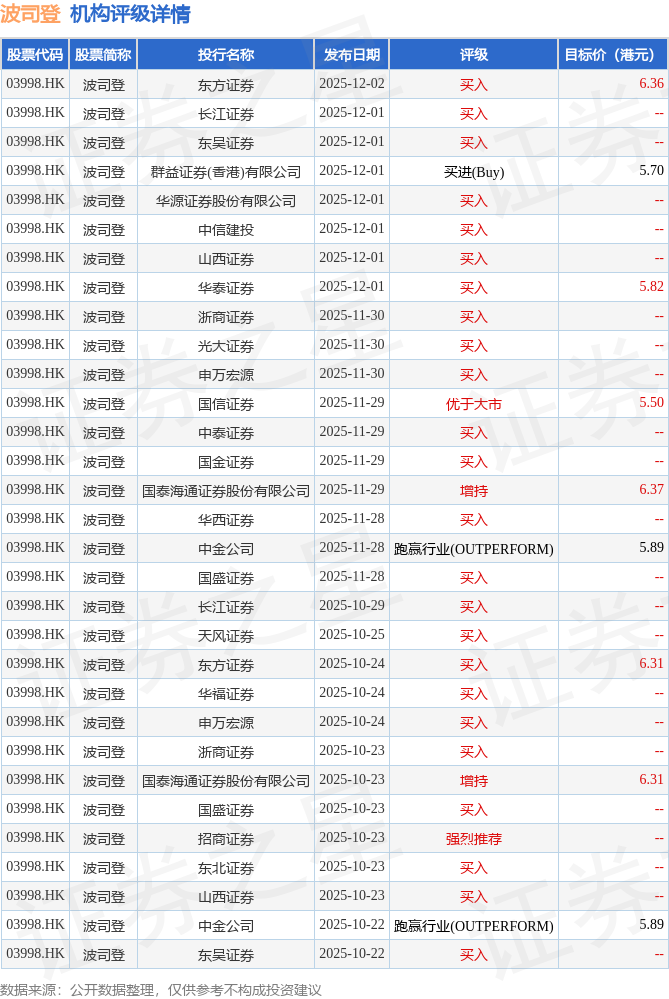 截至2025年12月2日收盘,波司登(03998.HK)报收于5.12港元,上涨2.2%,成交量3527.25万股,成交额1.8亿港元。投行对该股的评级以买入为主,近90天内共有24家投行给出买入评级,近90天的目标均价为6.02港元。东方证券最新一份研报给予波司登买入评级,目标价6.36港元。
