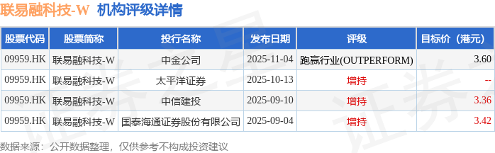 截至2025年12月2日收盘,联易融科技-W(09959.HK)报收于2.44港元,上涨0.41%,成交量342.34万股,成交额821.56万港元。投行对该股的评级以增持为主,近90天内共有3家投行给出增持评级,近90天的目标均价为3.46港元。中金公司最新一份研报给予联易融科技-W跑赢行业(OUTPERFORM)评级,目标价3.6港元。