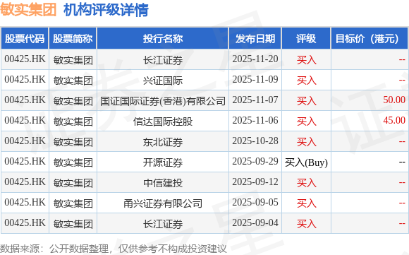 截至2025年12月2日收盘,敏实集团(00425.HK)报收于33.7港元,上涨0.12%,成交量300.39万股,成交额1.01亿港元。投行对该股的评级以买入为主,近90天内共有8家投行给出买入评级,近90天的目标均价为47.5港元。长江证券最新一份研报给予敏实集团买入评级。