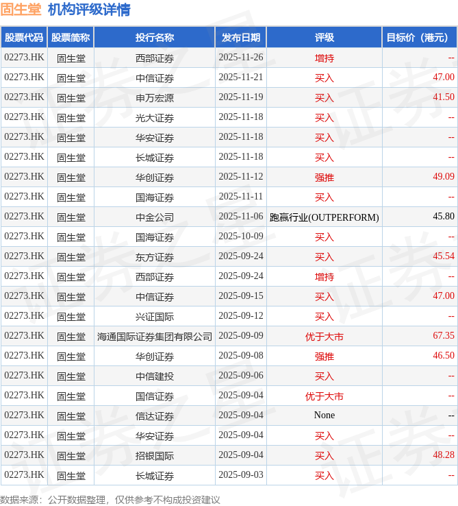 截至2025年12月2日收盘,固生堂(02273.HK)报收于29.1港元,上涨0.07%,成交量100.57万股,成交额2899.05万港元。投行对该股的评级以买入为主,近90天内共有14家投行给出买入评级,近90天的目标均价为48.67港元。西部证券最新一份研报给予固生堂增持评级。
