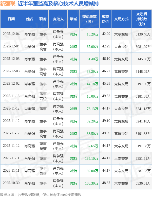 新强联近半年内的董监高及核心技术人员增减持详情如下: