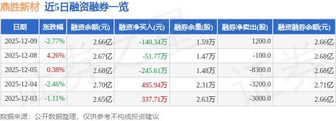 鼎胜新材融资融券信息显示,融资方面,当日融资买入2223.75万元,融资偿还2364.08万元,融资净偿还140.34万元。融券方面,融券卖出6700.0股,融券偿还5500.0股,融券余量1.59万股,融券余额21.18万元。融资融券余额2.66亿元。