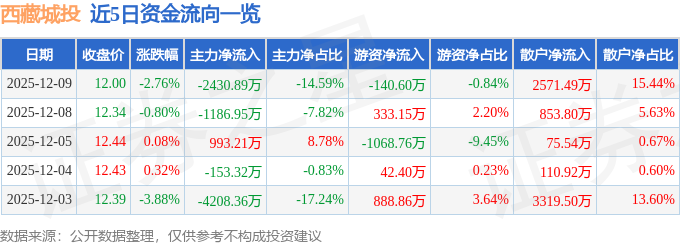 证券之星消息,截至2025年12月9日收盘,西藏城投(600773)报收于12.0元,下跌2.76%,换手率1.45%,成交量13.84万手,成交额1.67亿元。