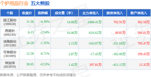 个股表现方面,个护用品行业当日领跌股为延江股份(300658),该股当日报收11.36,下跌4.3%,成交量14.86万,主力资金净流出1066.41万元。两面针(600249)以下跌2.54%紧随其后,该股当日成交量16.06万,主力资金净流出616.62万元。除此之外,洁雅股份(301108)、可靠股份(301009)、倍加洁(603059)均进入当日熊股之列。具体个股列表见下表: