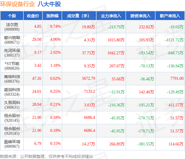 个股表现方面,环保设备行业当日领涨股为法尔胜(000890),该股当日报收4.85,上涨8.74%,成交量19.8万,主力资金净流出213.79万元。碧兴物联(688671)以上涨4.06%紧随其后,该股当日成交量4.31万,主力资金净流入1015.8万元。除此之外,先河环保(300137)、*ST节能(000820)、美埃科技(688376)均进入当日牛股之列。具体个股列表见下表: