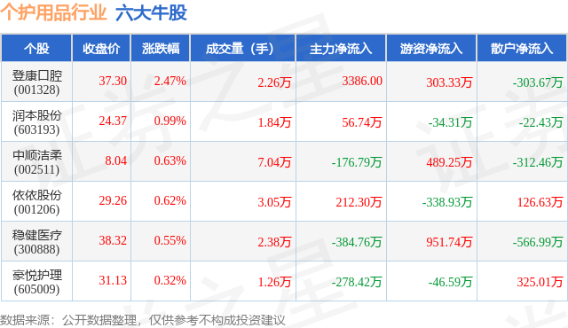 个股表现方面,个护用品行业当日领涨股为登康口腔(001328),该股当日报收37.3,上涨2.47%,成交量2.26万,主力资金净流入0.34万元。润本股份(603193)以上涨0.99%紧随其后,该股当日成交量1.84万,主力资金净流入56.74万元。除此之外,中顺洁柔(002511)、依依股份(001206)、稳健医疗(300888)均进入当日牛股之列。具体个股列表见下表: