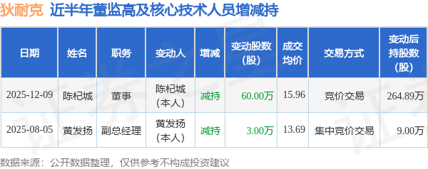 证券之星消息,根据12月10日市场公开信息、上市公司公告及交易所披露数据整理,狄耐克(300884)最新董监高及相关人员股份变动情况:2025年12月9日公司董事陈杞城共减持公司股份60.0万股,占公司总股本为0.2363%。变动期间公司股价下跌2.07%,12月9日当日收盘报16.06元。