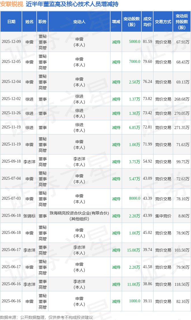 安联锐视近半年内的董监高及核心技术人员增减持详情如下:
