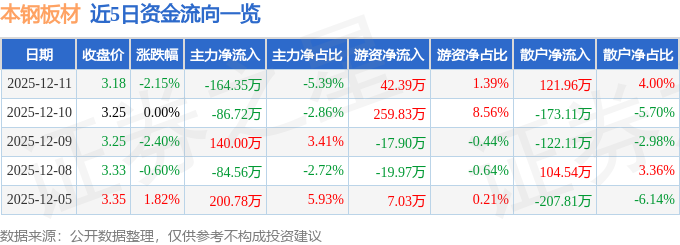 证券之星消息,截至2025年12月11日收盘,本钢板材(000761)报收于3.18元,下跌2.15%,换手率0.26%,成交量9.52万手,成交额3048.12万元。