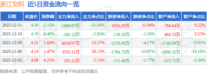 证券之星消息,截至2025年12月11日收盘,浙江交科(002061)报收于4.1元,下跌2.15%,换手率0.79%,成交量20.56万手,成交额8510.64万元。