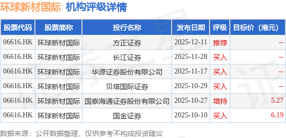 投行对该股的评级以买入为主,近90天内共有4家投行给出买入评级,近90天的目标均价为5.73港元。方正证券最新一份研报给予环球新材国际推荐评级。